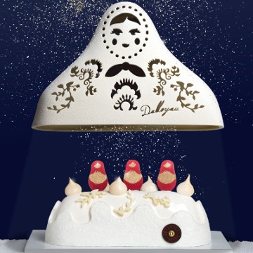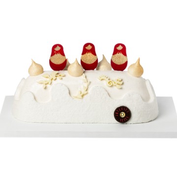 La bûche de Noël Dalloyau est toujours un succès chaque année ! Cette fois ci sous sa coque de chocolat blanc, elle est composée d’une confiture de lait parfumée au citron vert et de meringue aux amandes, avec en son coeur une compotée mangue-passion, un biscuit financier et une crème à la vanille de Madagascar. Je vous laisse imaginer le délice … En décor, de petites poupées matriochkas au chocolat au lait et des meringues inspirées des palais russes ! Édition limitée disponible jusqu’au 25 décembre.