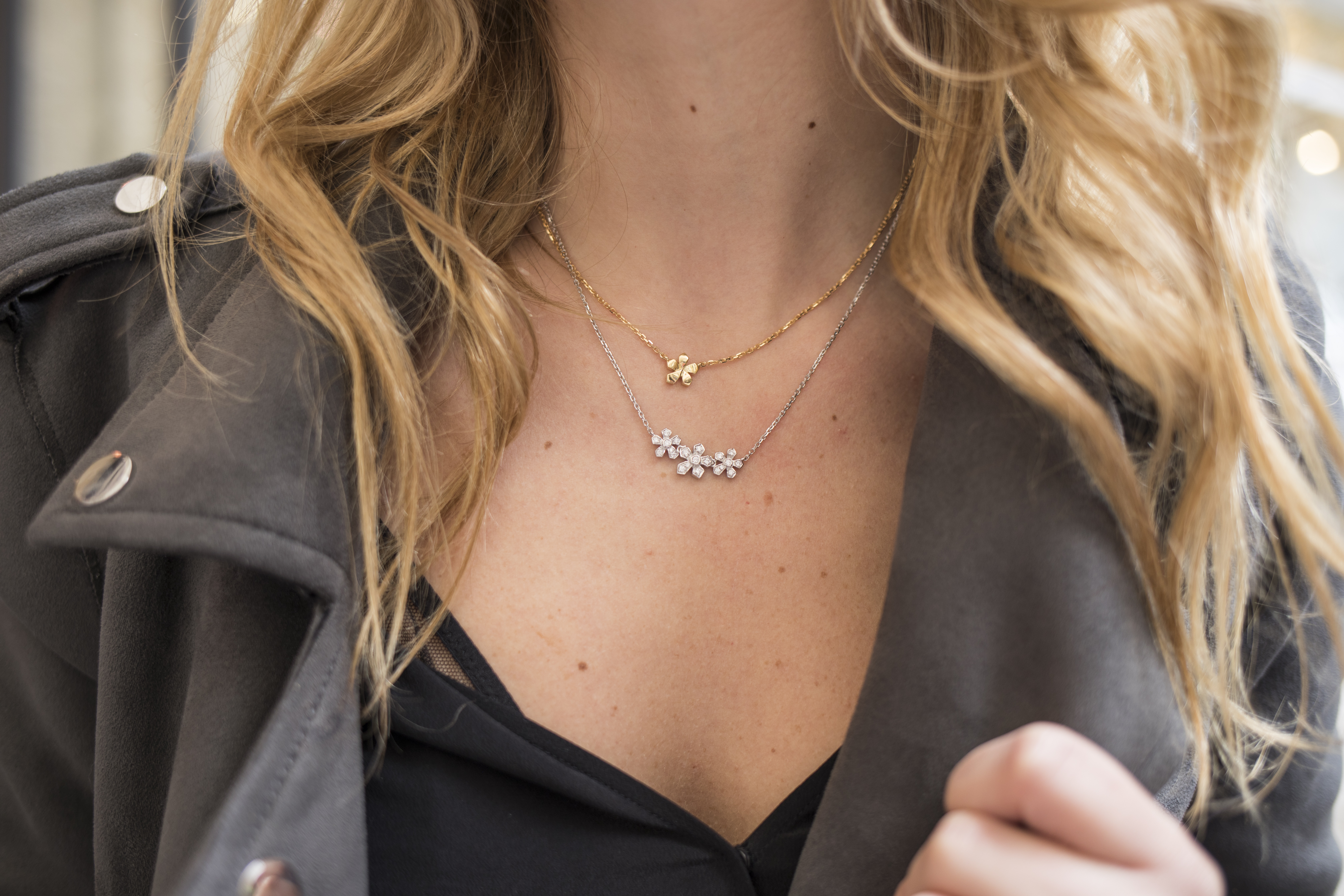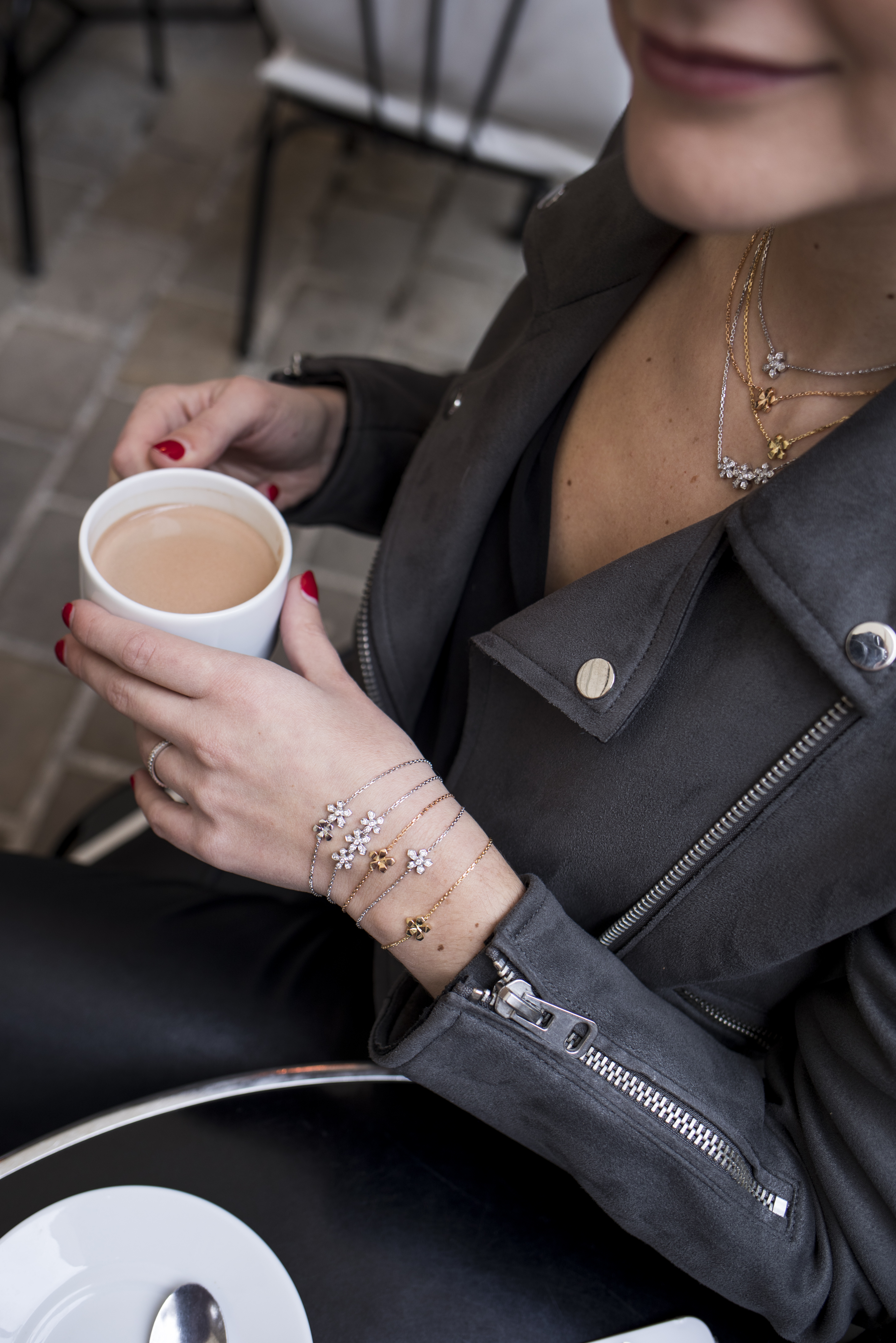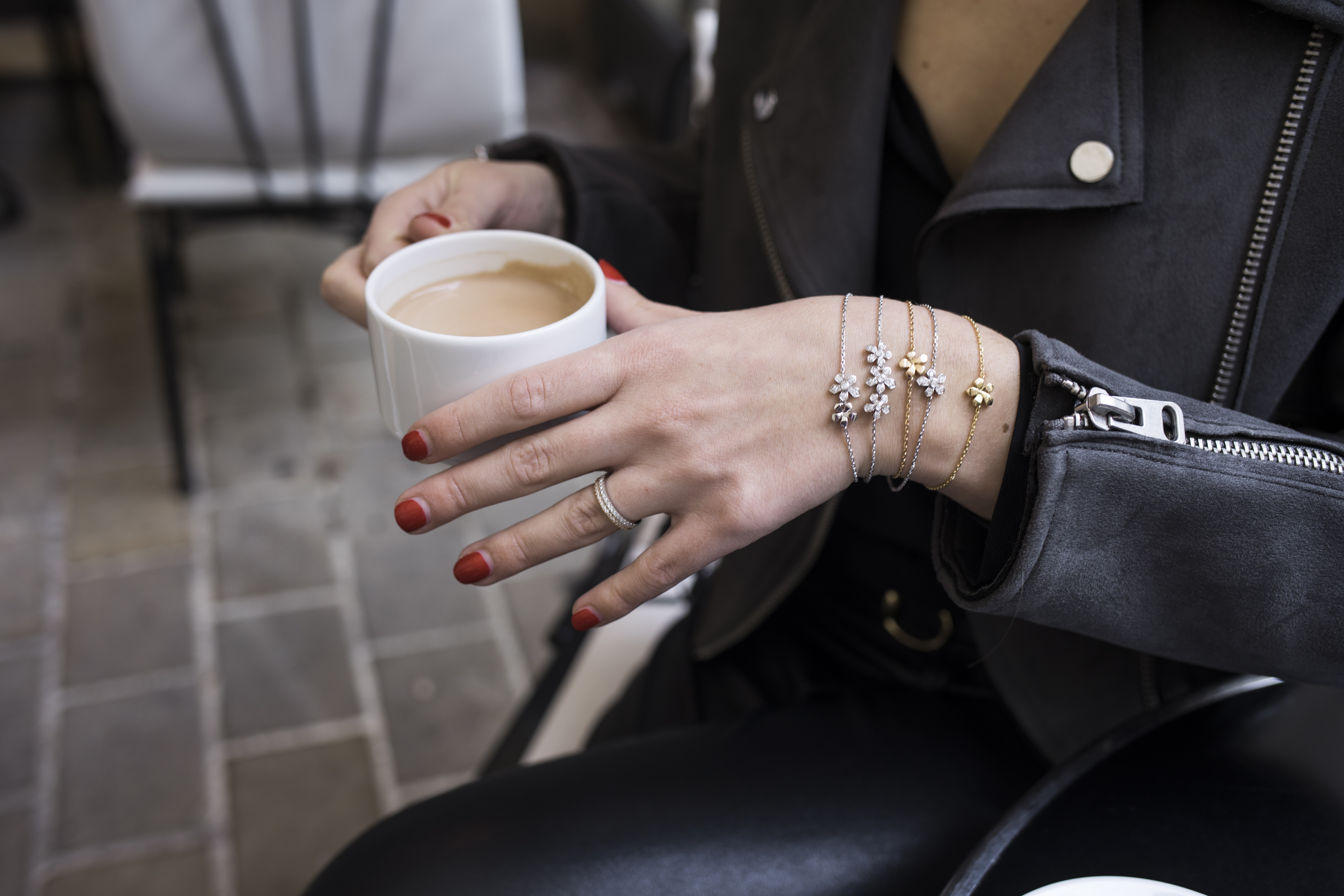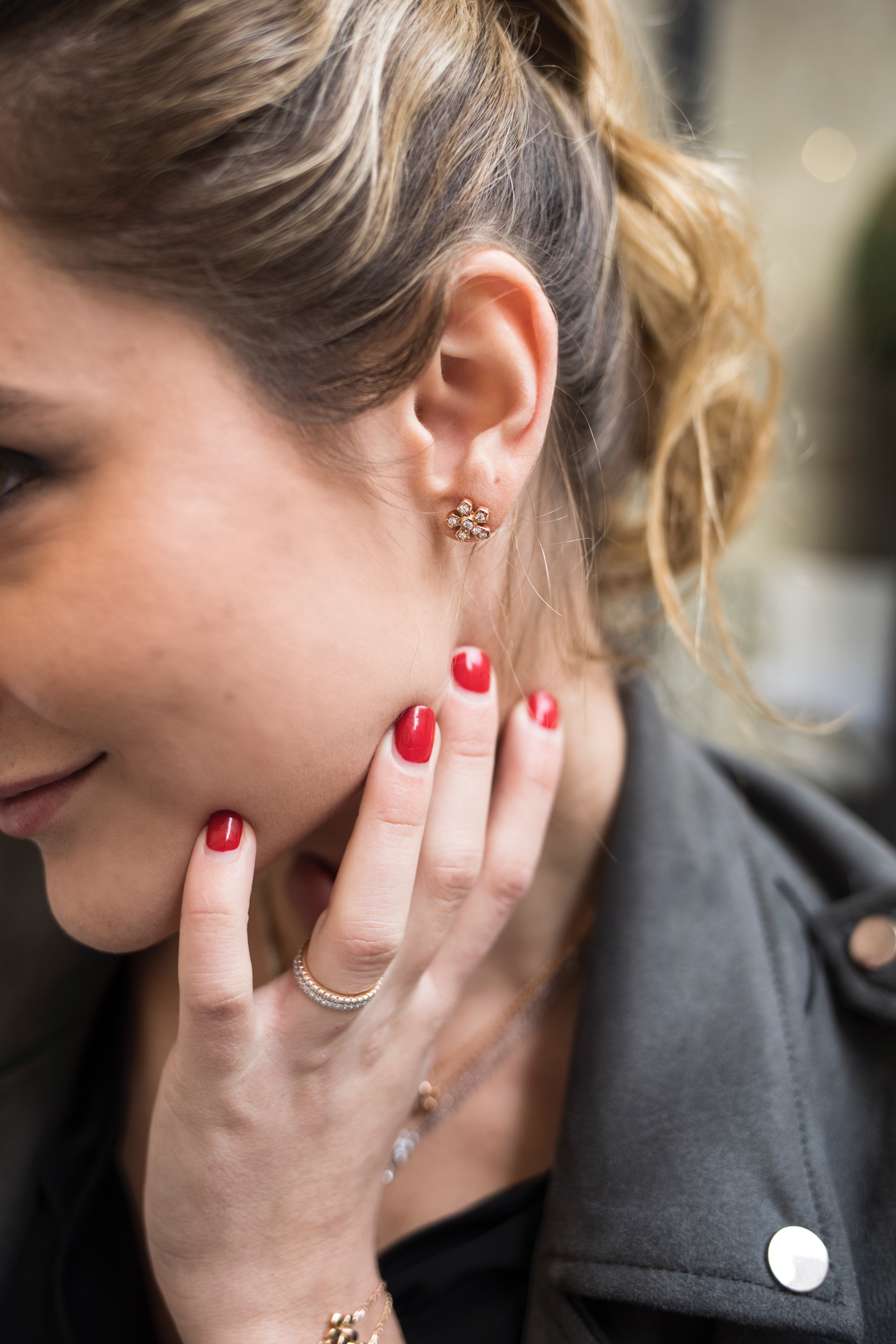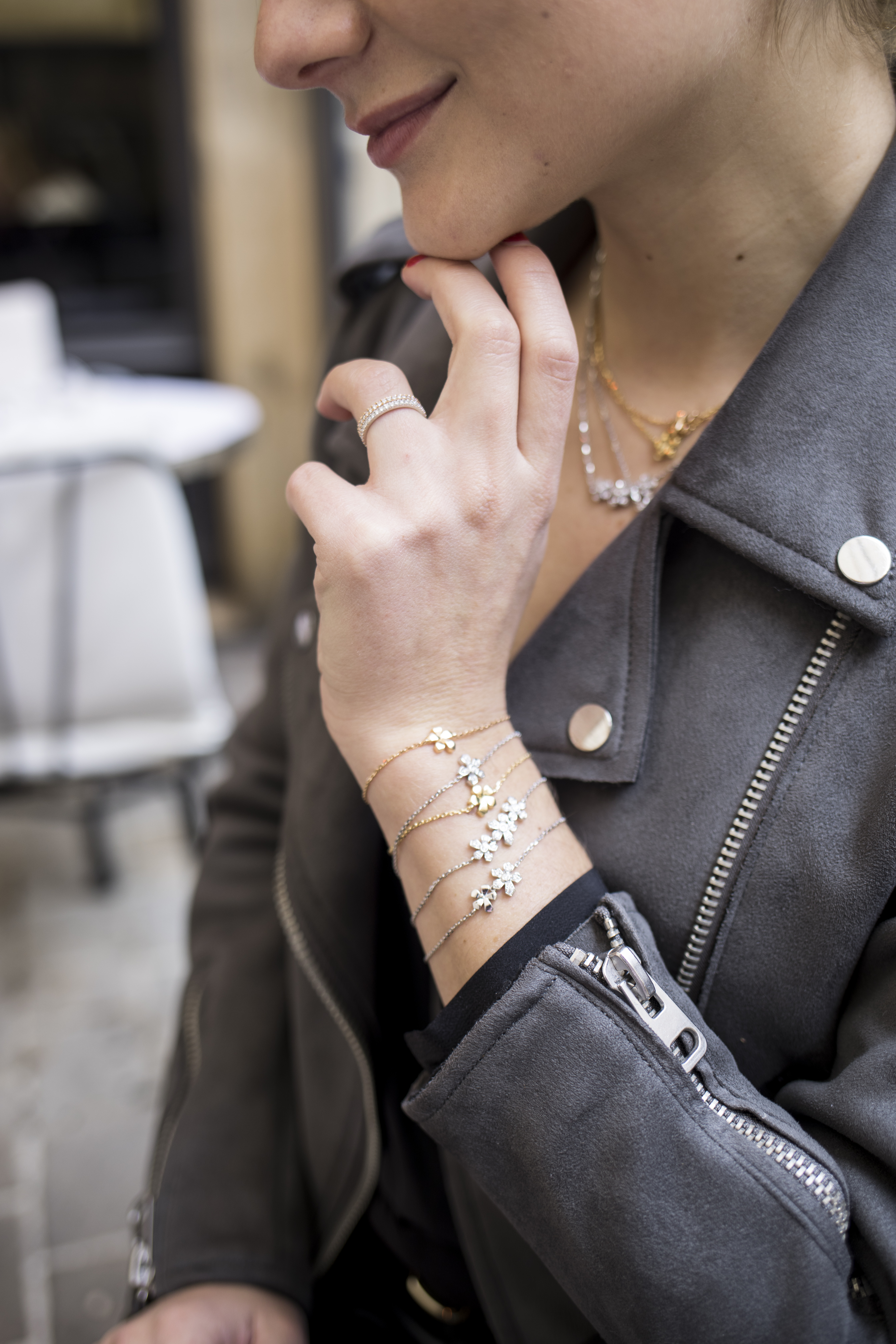 Le design des bijoux est très minimaliste, une simple fleur de jasmin stylisée à 5 pétales, juste ce qui faut pour que le bijou soit simple, élégant, sexy et délicat. Je porte systématiquement mes bijoux en accumulation pour un look plus mode et pour mettre en avant un décolleté ou un poignée ! Vous pouvez retrouver la collection déclinée dans les 3 ors, avec diamants ou tout or.