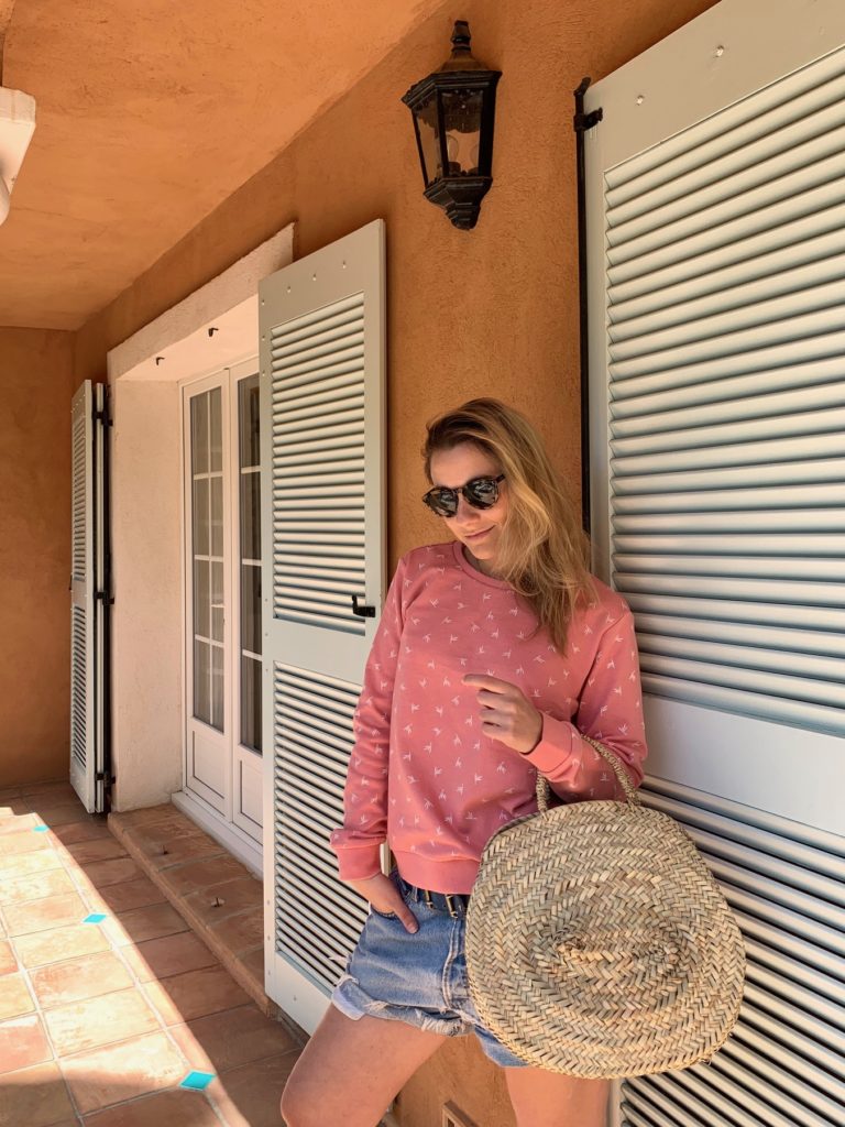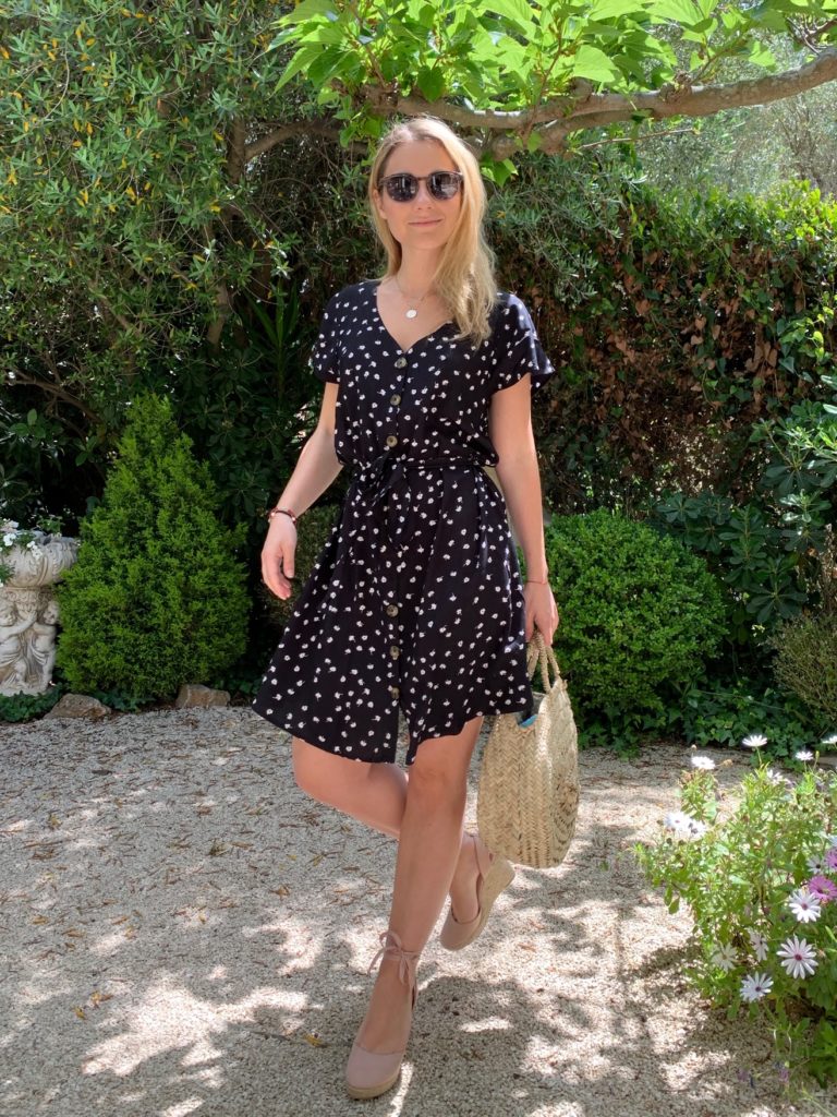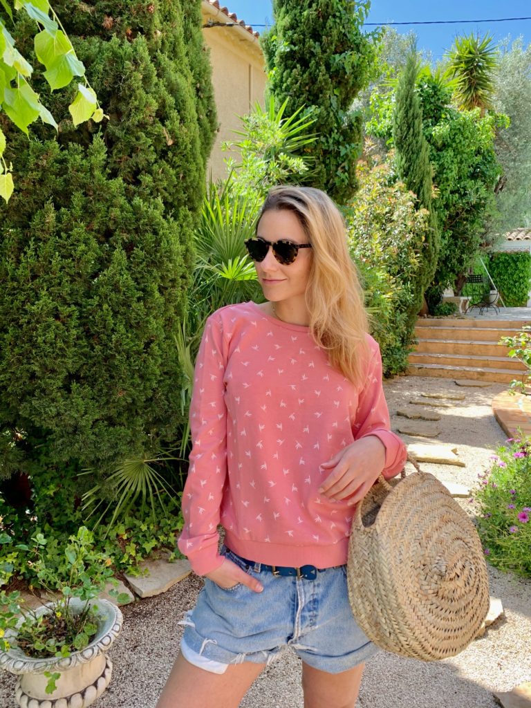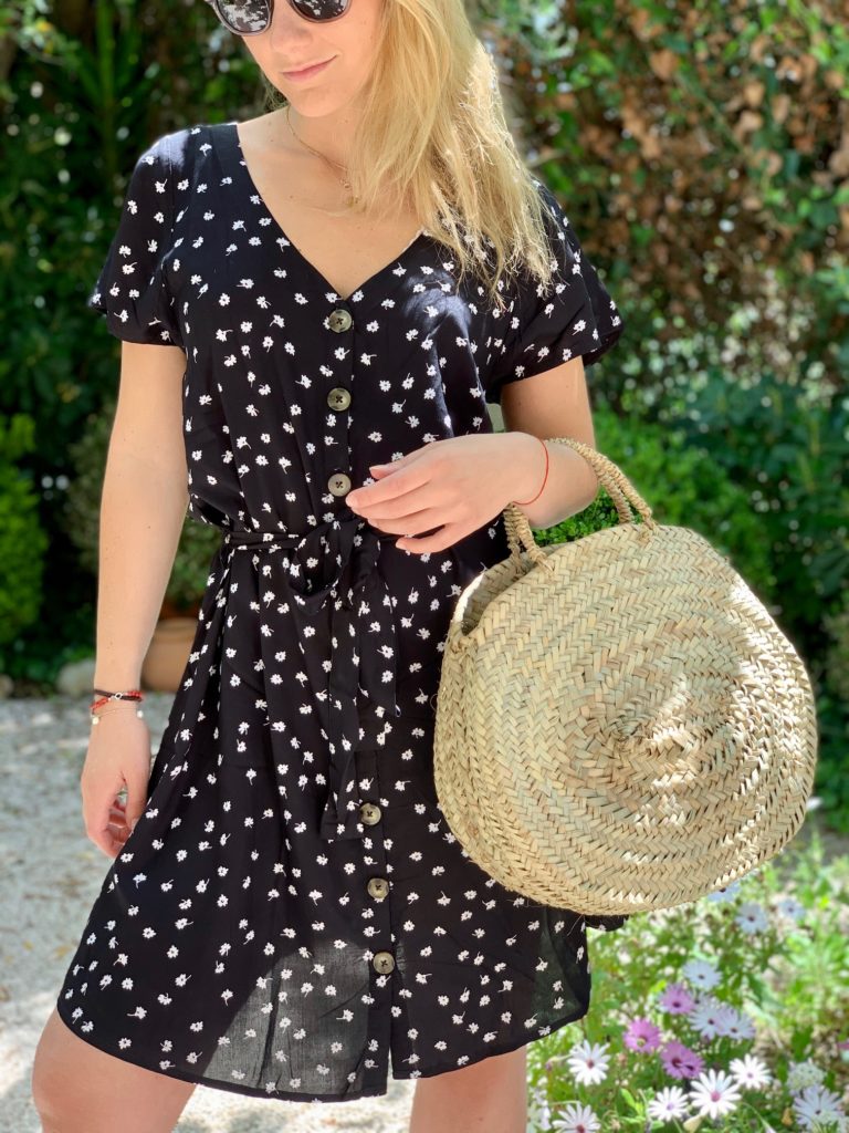 De mon côté, j’ai craqué pour cette jolie petite robe noire très légère à motifs. Elle est boutonnées sur le devant et peut être ceinturée à l’aide d’un bout de tissu incorporé. Je la porte avec de jolis compensés très estivals. Pour un look plus cool, j’ai opté pour le short en jean avec un débardeur blanc ou un pull rose ambiance « after surf ».